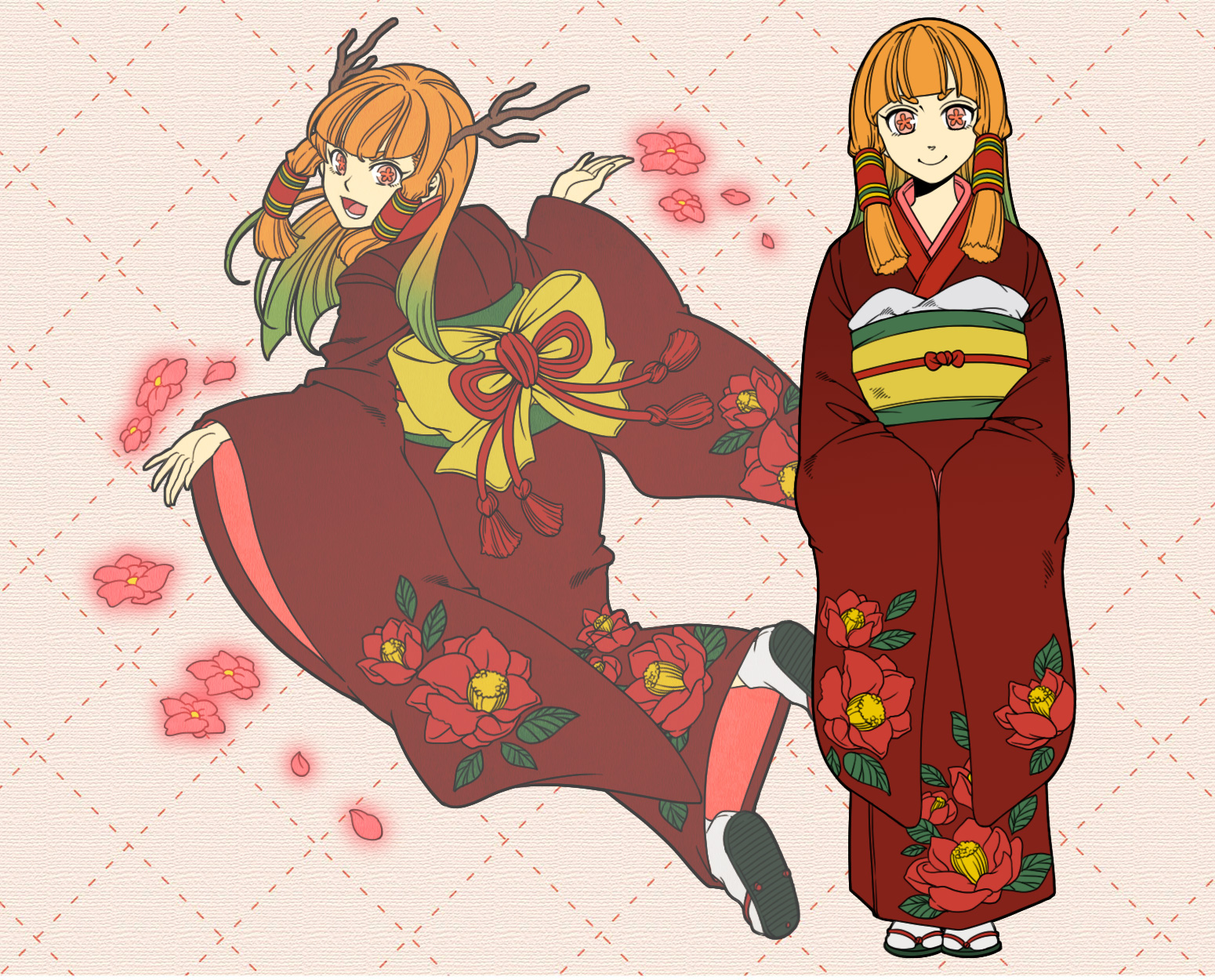 名前:樹瑰埜 椿姫 (じゅがいや つばきひめ) 種族:木鬼(もっき) 外見年齢:17歳くらい 実年齢:120歳くらい 身長:155㎝ つるぺた体系を気にする年頃の乙女。一応いいとこの御嬢さん。 こめかみのあたりから、木の枝のような角が後ろに向かって生えている。 先端に行くにつれて少し枝分かれしたそれは、うれしいことがあると花が咲く。 角に花が咲くのを通り越すうれしさがあると周りがリアルお花畑になる。 許嫁いるけど、クーさんに絶賛片思い中。けどツンデレ。 モリガンちゃんとは恋のライバルでありよき友達。 バロールさんの想いには気付いていません。 擬態時には角を隠す。料理の腕が残念極まりない。 淡鐡 (えんてつ) 椿の許婚の種族:焔鬼(ほむらおに)の青年 穏やかで礼儀正しく、武士道に沿った行いを良しとする天然ボケのちょっとめんどくさい子。 好物はスカアハにもらったヴェ●タースオリジナル。椿に全力投球だが相手にされていない。 からかったりしても真面目に返してくるので扱いづらい。たまに腹黒?な一面を見せたりする。 椿の一族と少し似ていて、嬉しいことがあると角の周りに焔が灯る。 逆に怒った時は目元に真っ赤な焔を灯るので見間違いに要注意。 PR |